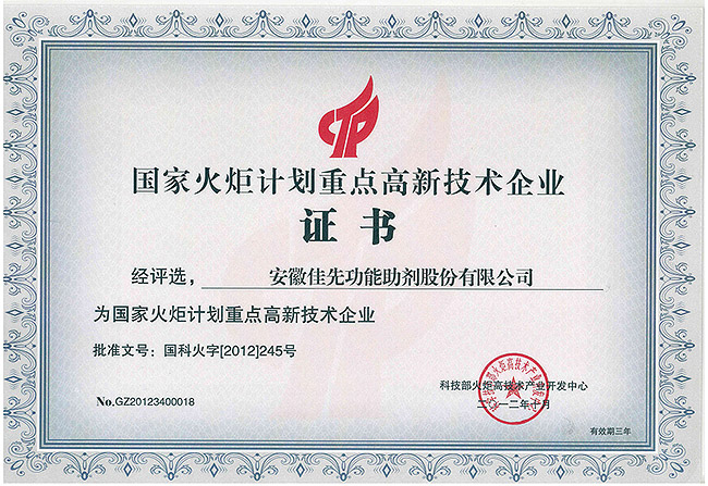 佳先股份國(guó)家火炬計(jì)劃重點(diǎn)高新技術(shù)企業(yè)