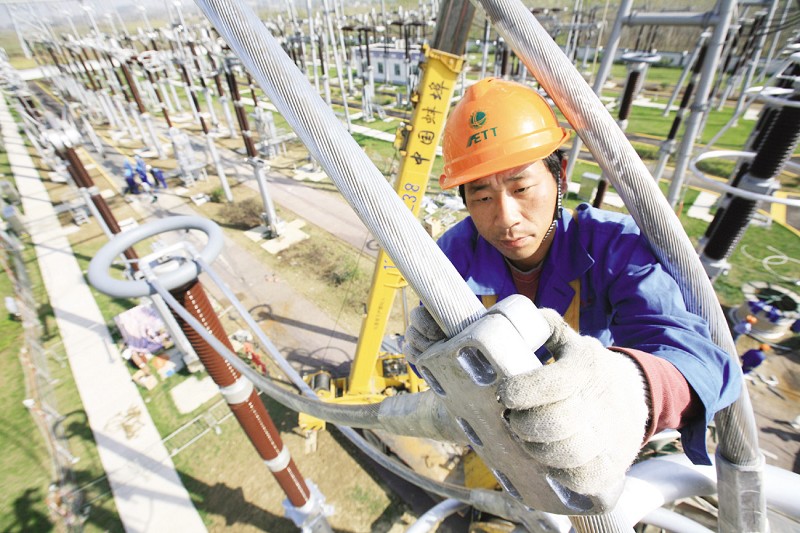 圖為安徽省電力公司員工在安裝線路反弓設(shè)備。