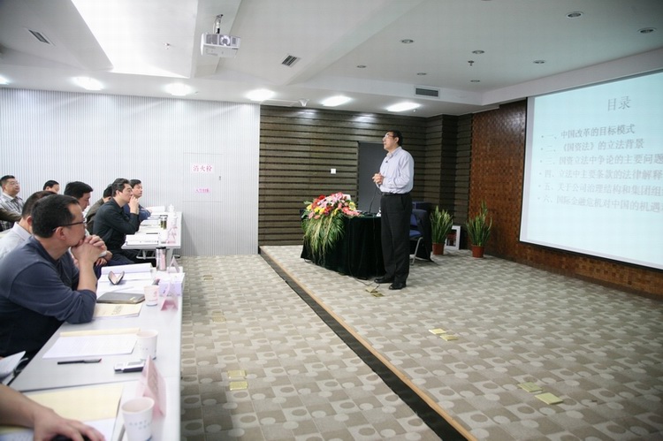劉紀(jì)鵬教授對中國改革的目標(biāo)模式、國資改革中的政府定位、《國有企業(yè)資產(chǎn)法》的立法背景、立法中爭論的主要問題、主要條款的法律解釋等問題做了深入的講解,并對參會人員提出的疑問做了認(rèn)真的解答。此外,他還就國際金融危機(jī)對中國發(fā)展的機(jī)遇和挑戰(zhàn)提出了自己的獨到見解。