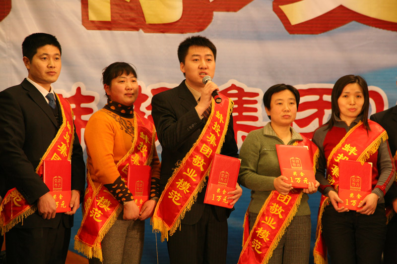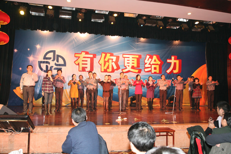 酒會上,公司表彰了2010年度6名創(chuàng)新標(biāo)兵和32名敬業(yè)模范,公司領(lǐng)導(dǎo)分別為敬業(yè)模范頒發(fā)證書和獎金,張孝成副市長為創(chuàng)新標(biāo)兵頒發(fā)證書、獎金并致辭,肖超秘書長、創(chuàng)新標(biāo)兵及敬業(yè)模范抽出19名幸運的獲獎員工,為大家呈上了精神大餐和物質(zhì)大餐;著名喜劇表演藝術(shù)家陳佩斯領(lǐng)銜主演的話劇《雷人晚餐》在蚌埠大劇院隆重上演,員工們在酒會上獻(xiàn)出精彩紛呈的歌舞表演,為集團(tuán)員工及珠城人民奉上文化大餐。與會人員舉杯同飲,共慶農(nóng)歷新年的到來。