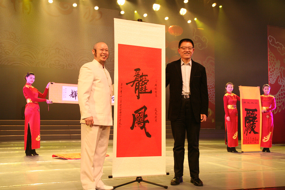 副市長(zhǎng)江婭致詞 以沙畫(huà)的形式表現(xiàn)集團(tuán)的發(fā)展 奇人書(shū)法家贈(zèng)送書(shū)法作品(蚌投有為 鳳凰騰飛) 邀請(qǐng)嘉賓鞏漢林、金珠表演精彩節(jié)目