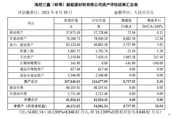 蚌埠投資集團(tuán)有限公司擬轉(zhuǎn)讓所持??厝危ò霾海┬履茉床牧嫌邢薰竟蓹?quán)的行為已經(jīng)市國資委批復(fù)同意。根據(jù)國有資產(chǎn)管理及資產(chǎn)評(píng)估有關(guān)規(guī)定,現(xiàn)對(duì)所涉及的資產(chǎn)評(píng)估結(jié)果進(jìn)行公示。