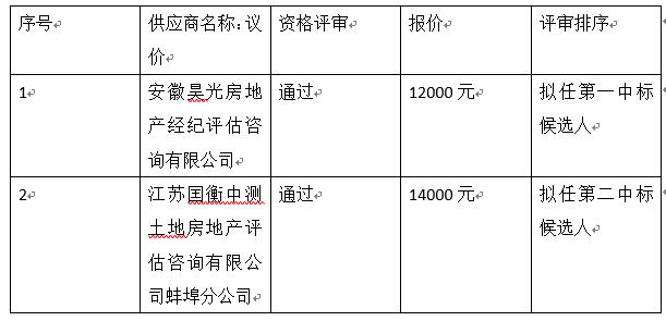 高鐵蚌埠南站西廣場(chǎng)、蚌投科技園物業(yè)服務(wù)費(fèi)評(píng)估項(xiàng)目于2021年10月18日發(fā)布招標(biāo)公告,經(jīng)兩次流標(biāo),第三次招標(biāo)公共于2021年11月04日發(fā)布,2021年11月11日9:00本項(xiàng)目開(kāi)標(biāo),三家報(bào)名現(xiàn)場(chǎng)兩家參與,按招標(biāo)文件要求現(xiàn)場(chǎng)議價(jià),經(jīng)過(guò)專(zhuān)家評(píng)審,經(jīng)與投標(biāo)單位溝通均表示不再下浮,按招標(biāo)文件要求符合議價(jià)程序。現(xiàn)公告排名如下: